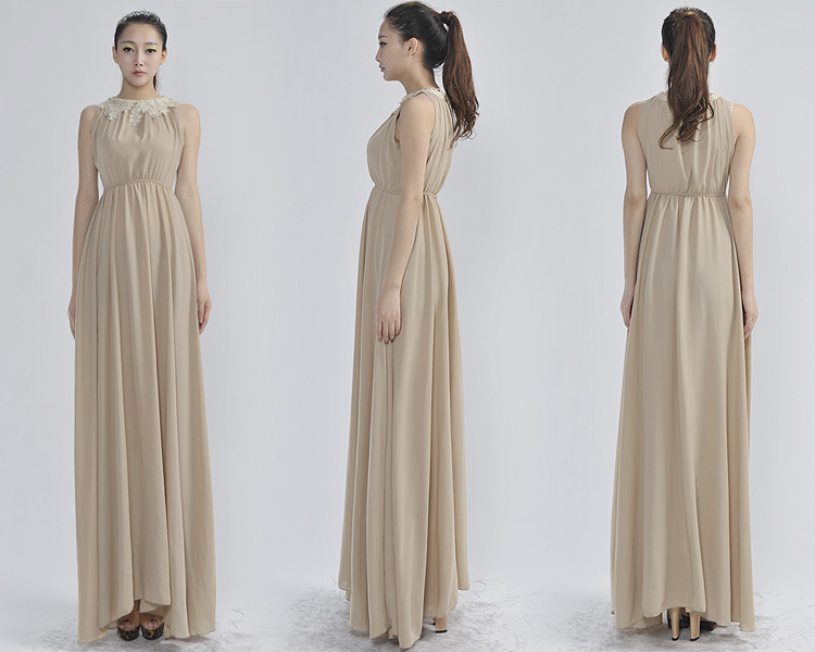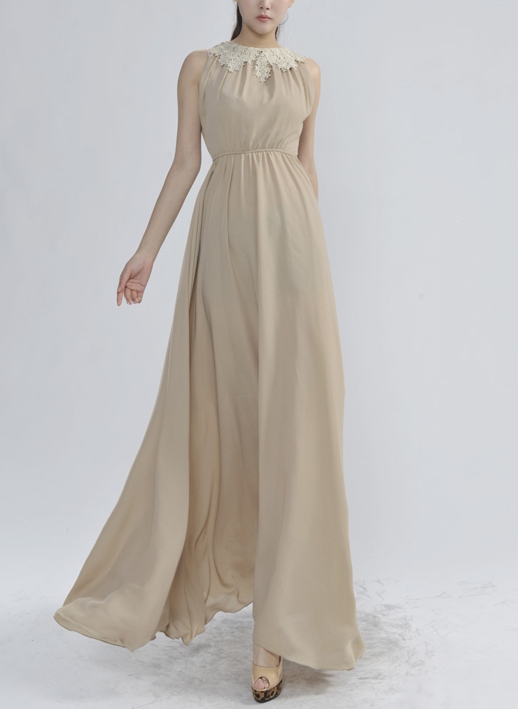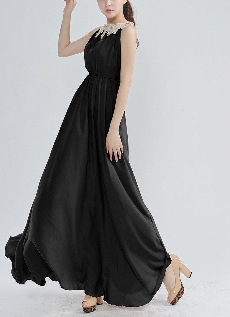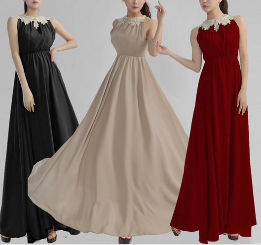 Վզի կլոր բացվածքով, առանց թևերի, գոտկային հատվածում էլաստիկ, վզային հատվածում ժանյակավոր, գեղեցիկ երեկոյան շրջազգեստ: