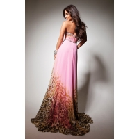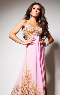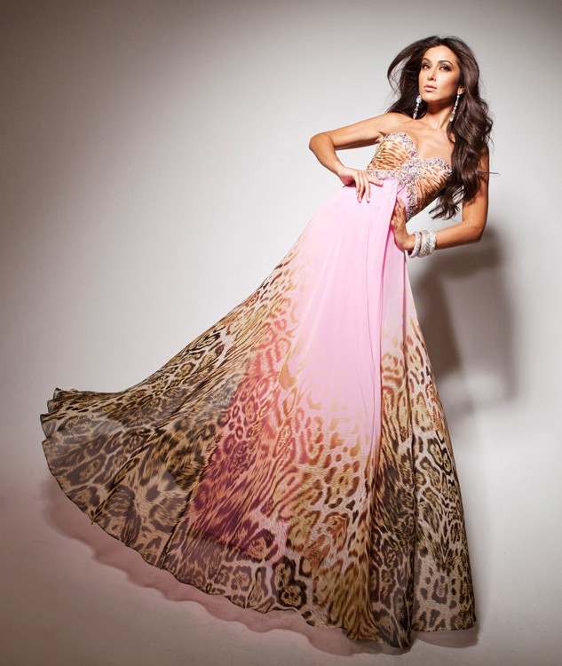 Առանց ուսակապերի, սրտաձև բացվածքով, կրծքավանդակի հատվածում քարերով, կրծքավանդակից ներքև թույլ, երկար, վագրային նախշով երեկոյան զգեստ: