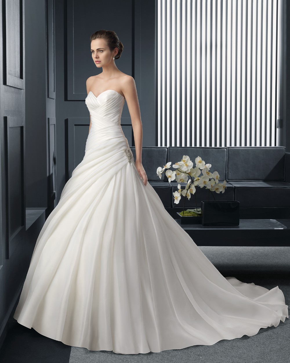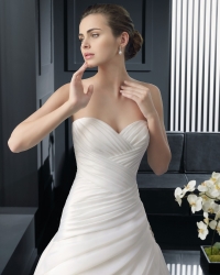 Առանց ուսակապերի, սրտաձև բացվածքով, գոտկային հատվածից լայնացող, նուրբ դիզայնով հարսանեկան զգեստ, որը Ձեզ ենք ներկայացնում Two by Rosa Clará նորաձևության տնից: