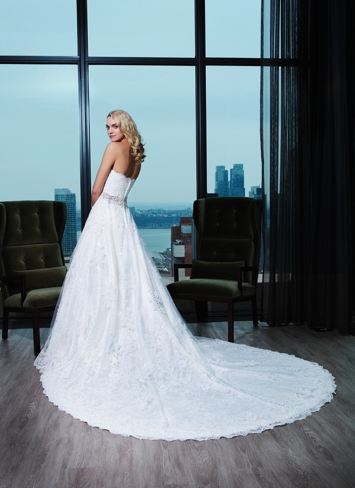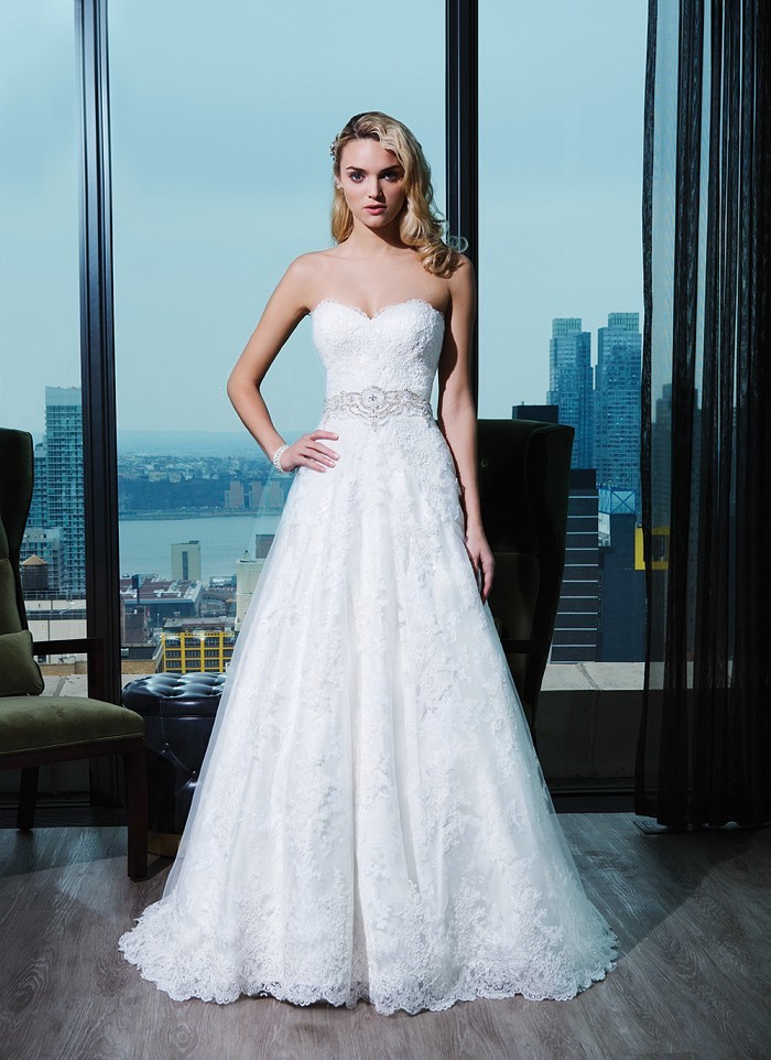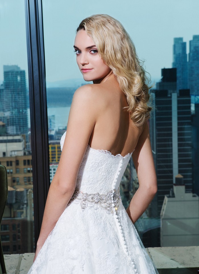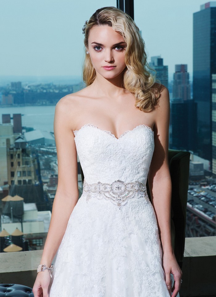 Առանց ուսակապերի, սրտաձև բացվածքով, ամբողջությամբ ժանյակավոր գոտկային հատվածում քարերից գոտիով, մեջքային հատվածում կոճակներով, գեղեցիկ հարսանեկան զգեստ, որը Ձեզ ենք ներկայացնում Two by Rosa Clará նորաձևության տնից: