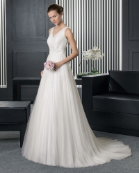 Առաջամասում V-աձև բացվածքով, ետևի հատվածում կլոր բացվածքով, առանց թևերի, մեջքային հատվածում տերևների նախշեվ, գեղեցիկ հարսանկենա զգեստ, որը ձեզ ենք ներկայացնում Two by Rosa Clará նորաձևության տնից: