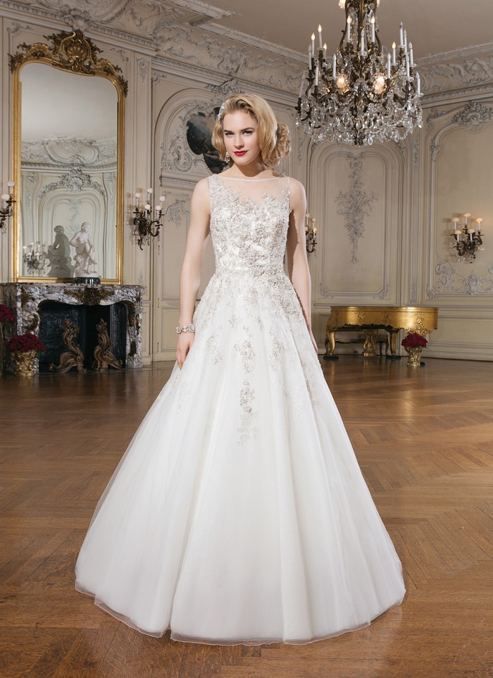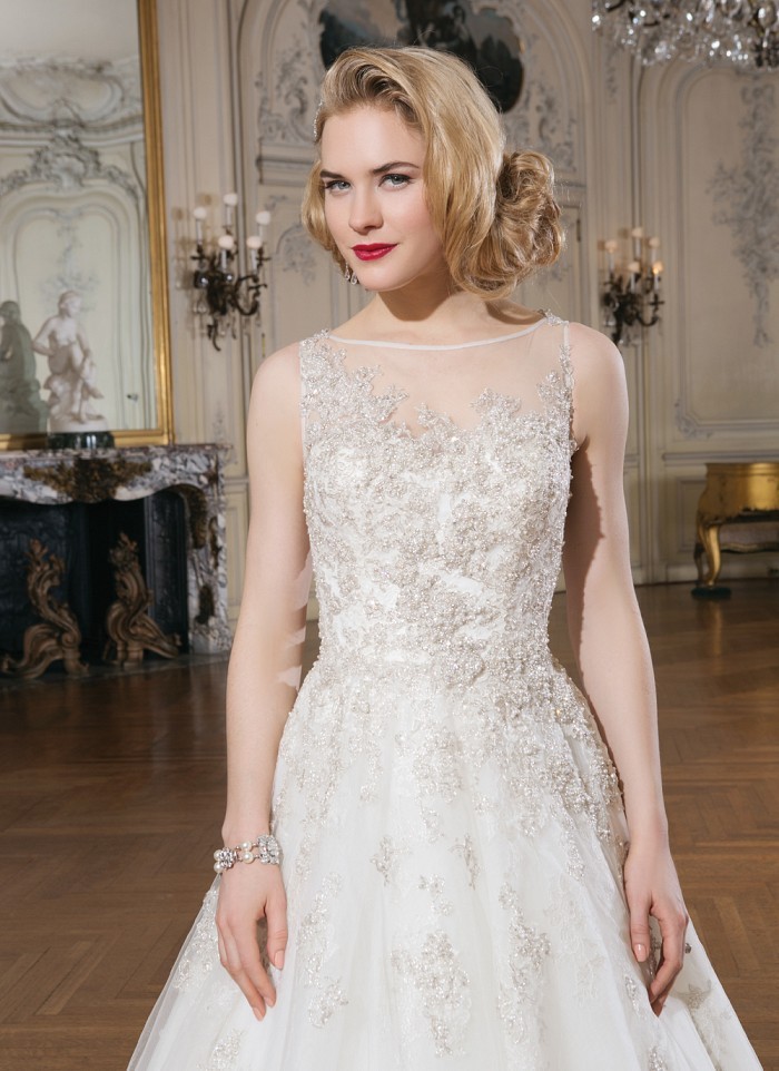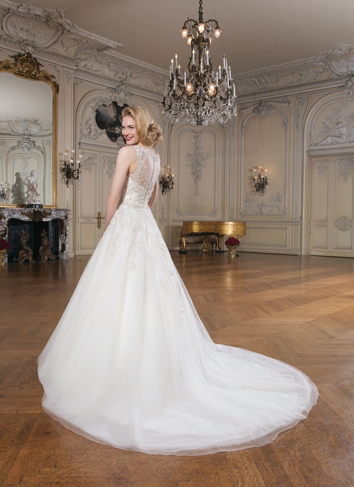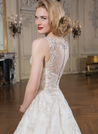 Վզի լայնակի բացվածքով, անթև ժանյակավոր, մեջքային հատվածում կոճակներով, երկար ձգվող փոշով, նորաձև հարսանեկան զգեստ: