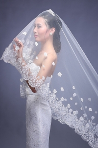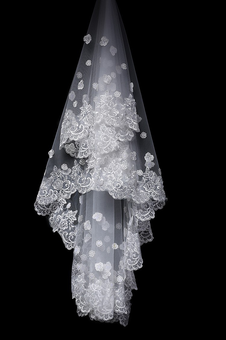 Երկար ձգվող հարսանեկան քող, որն ունի ժանյակներից ստացած վարդերի նախշ: