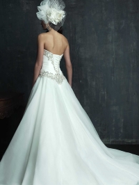 Վզի սրտաձև բացվածքով, անձև, վերևի հատվածում քարերով պատված, կոնքային հատվածից լայնացող, մեջքային հատվածում կապիչներով, երկար փեշով, ներաձև հարսանեկան զգեստ: