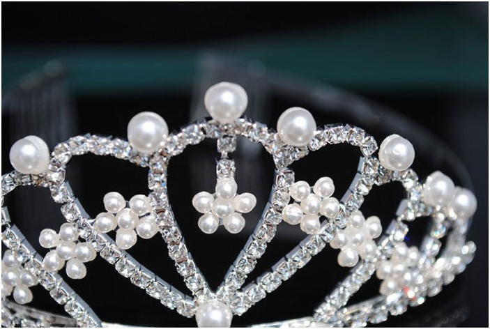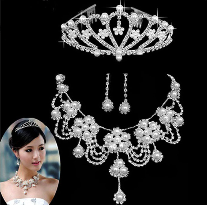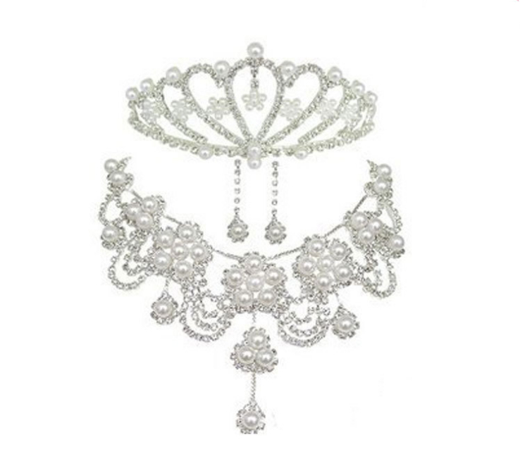 Մարգարտյա քարերով պատված գեղեցիկ աքսեսուար կազմված թագից, օղերից և վզնոցից: