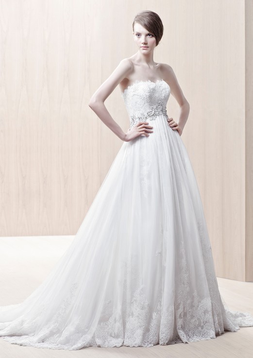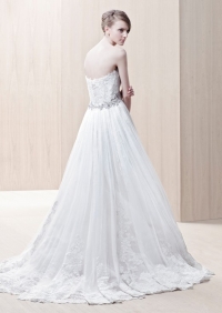 Առանց ուսակապերի, վերևի հատվածում ժանյակավոր, գոտկային հատվածում յուրօրինակ գոտիով, գեղեցիկ հարսանեկան զգեստ: