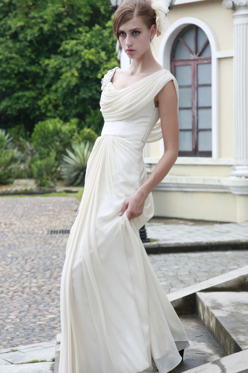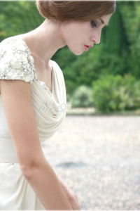 Վզի և մեջքային հատվածում կլոր բացվածքով, կիսաթև, թևերի հատվածում ամբողջությամբ քարերով պատված, կրծքավանդակից ներքև մետքասե գոտիով, երկար, էլեգանտ հարսանեկան զգեստ: