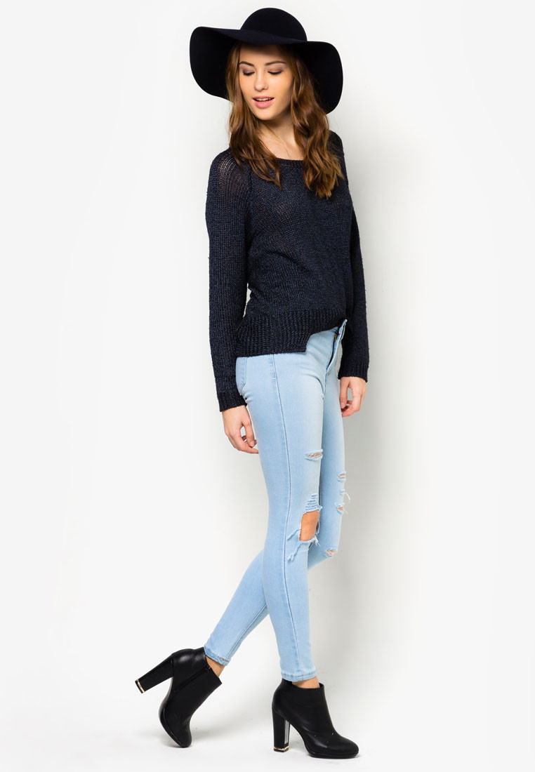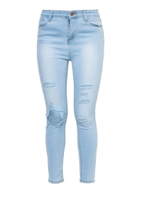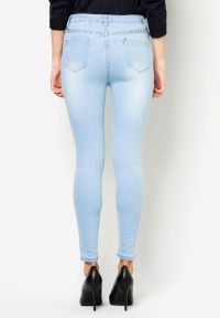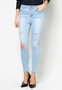 Միջին բարձրության գոտկային հատվածով, առաջամասում պատռվածքներով, վերևից նեղացող գեղեցիկ ջինսե տաբատ: