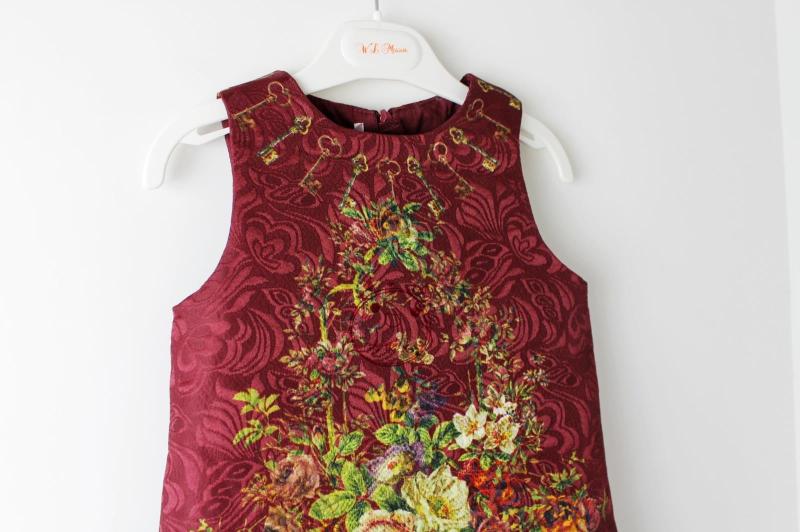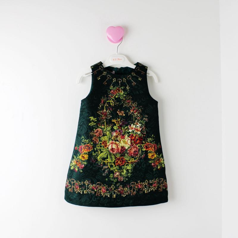 Վզի կլոր բացվածքով, անթև, բանալիների և ծաղկային նախշերով գեղեցիկ շրջազգեստ: