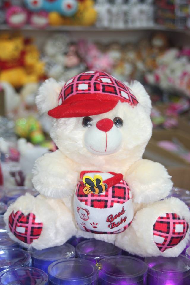 Գլխարկով, կարմիրի և մարմնագույնի համադրությամբ գեղեցիկ փափուկ խաղալիք աջի տեսքով: