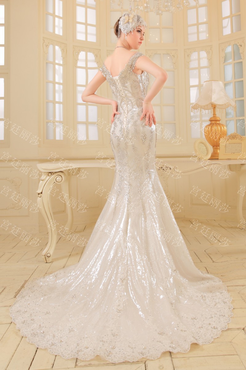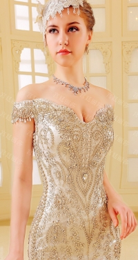 Վզի լայնակի բացվածքով, ամբողջությամբ քարերով պատված, երկար փեշով, ինքնատիպ, յուրօրինակ գեղեցիկ հարսանեկան զգեստ: