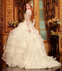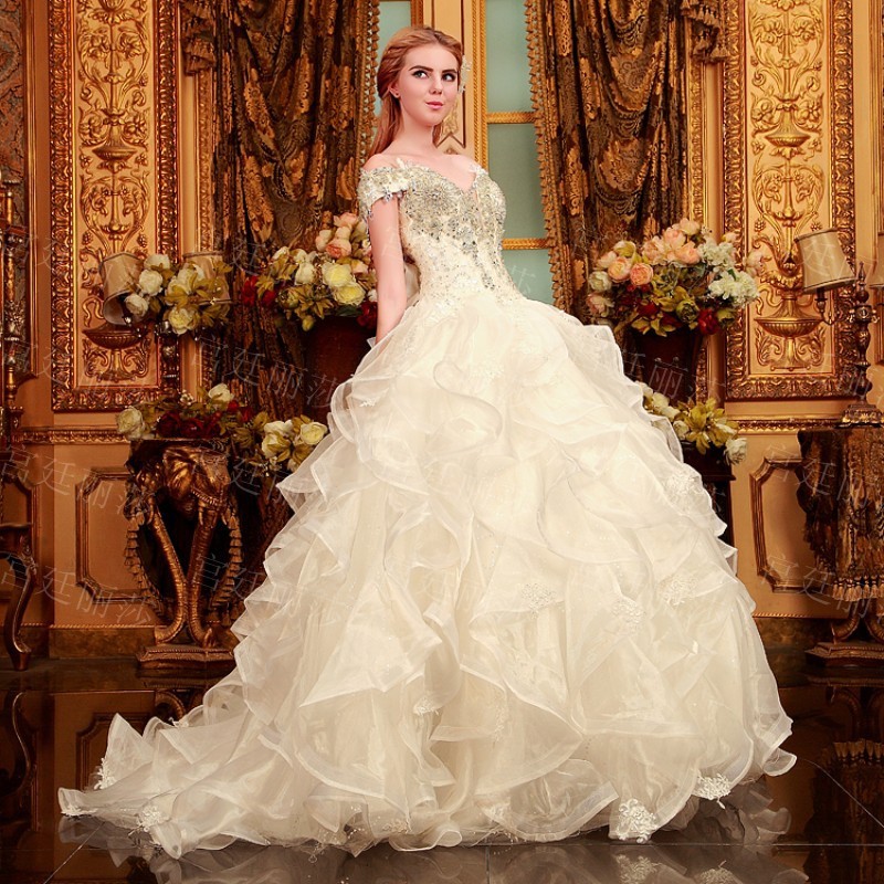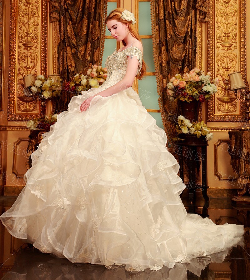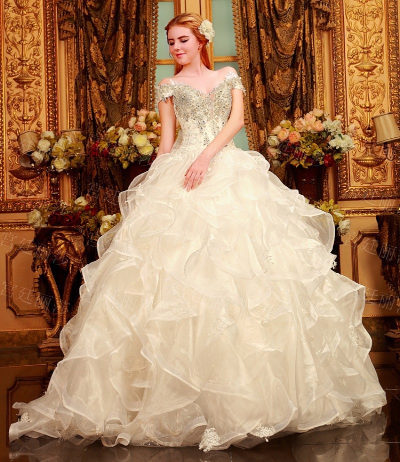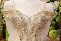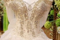 Վզի լայնակի բացվածքով, քարերով պատված, փոռերով, երկար փեշով գեղեցիկ հարսանեկան զգեստ: