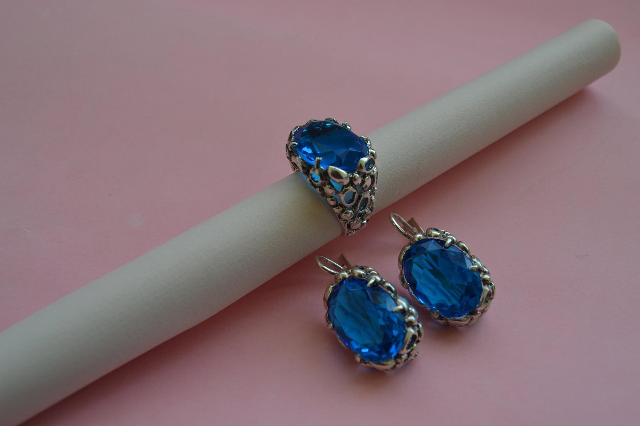 Լազուրյա կապույտ թափանցիկություն ունեցող գեղեցիկ քարով գեղեցիկ արծաթյա հավաքածու: