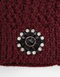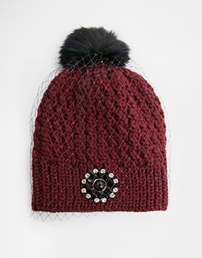 Առաջամասում քարերով պատված, քողով, մորթե փոմփոլիկով, գործվածքային, նորաձև գլխարկ: